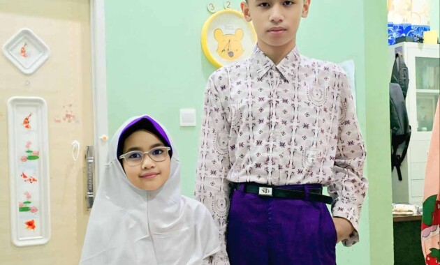 Si sulung sudah berdiri tegak dengan kemeja batiknya yang rapi, songkok hitam bertengger manis di kepalanya. Kelas 6 SD—betapa cepat waktu berlalu. Masih terasa seperti kemarin dia merengek minta diantar ke kelas 1, kini dia sudah menjadi abang yang dewasa untuk adiknya.